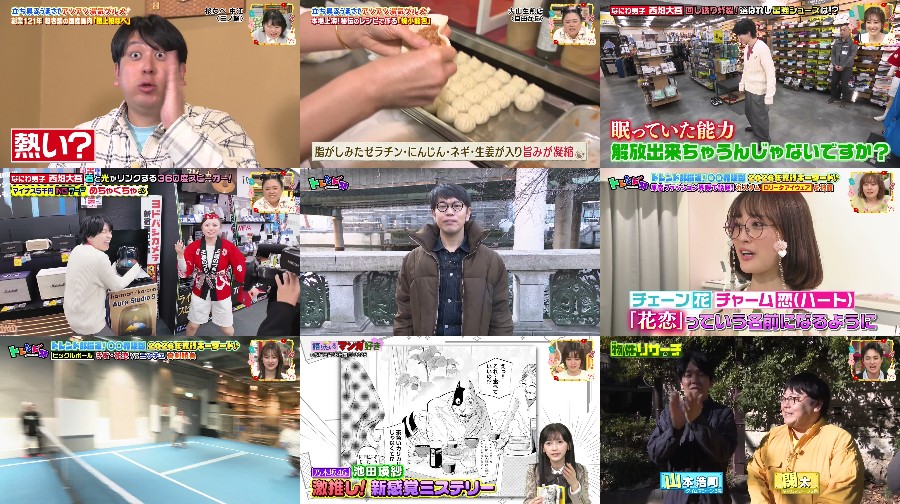 A Japanese TV show features a variety of segments, including "Gohan Club", "Shopping Expert", "Trendy Corner", "Property Research", and "Manga Enthusiasts". The show is hosted by a team of presenters, including Satō Kairi, Fujiwara Shingo, and Nichē, among others. The program showcases delicious food, such as steaming hot gourmet dishes, including premium hot pot and juicy soup dumplings. The show also features popular celebrities, like Naniwa Danshi’s Nishihata Daigo and Nogizaka46’s Ikeda Erika, who share their favorite manga recommendations. The theme song of the show is "Holiday" by Marcy.